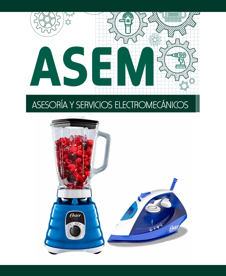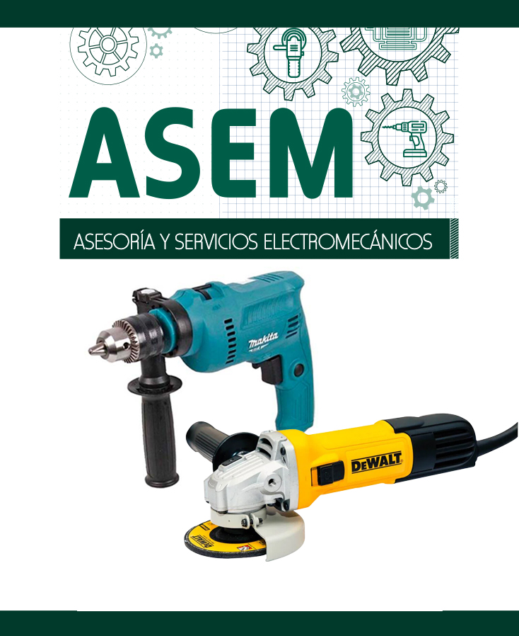 ASEM tiene una experiencia de 28 años en el mercado, prestamos servicios y asesorias electromecánicas a los sectores industrial, microempresarial, comercial y doméstico del sur del valle de aburrá. Bobinamos motores electricos, reparamos herramienta electrica, realizamos mantenimiento a maquinaria industrial, electrodomésticos , venta de repuestos , entre otros. Brindamos soluciones productivas, confiables , responsables y oportunas..
